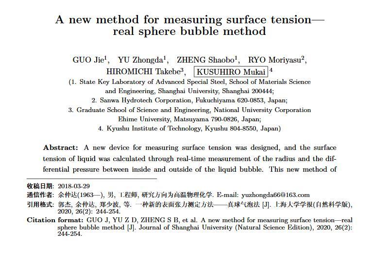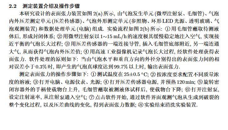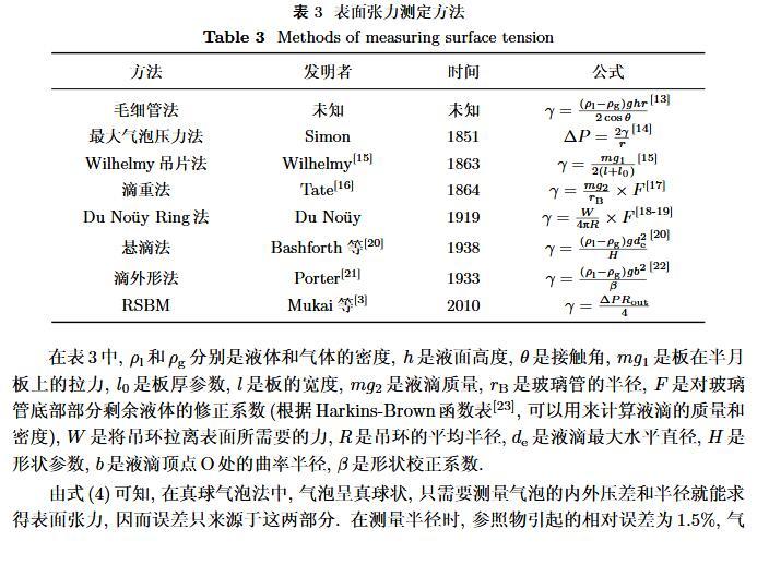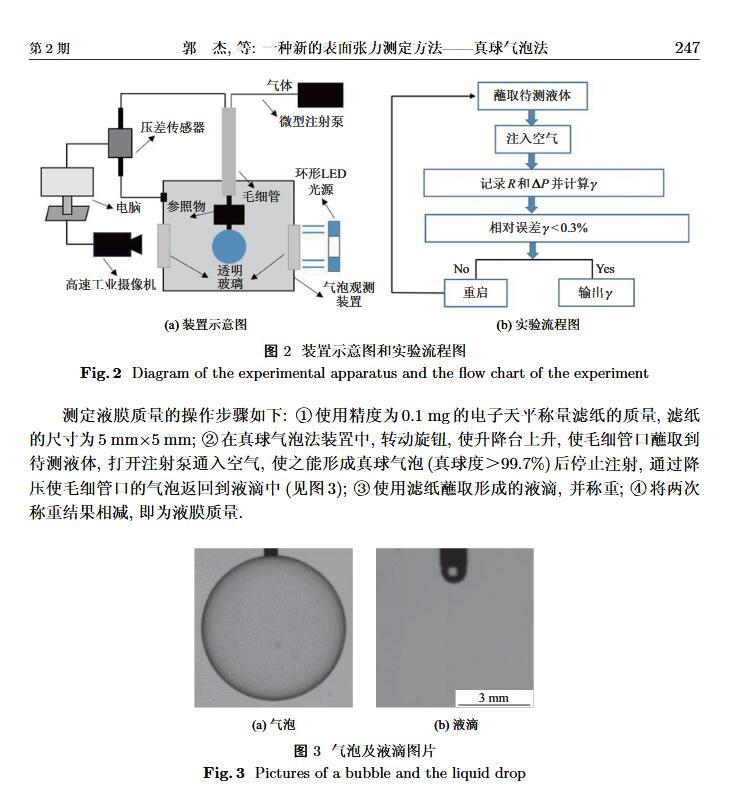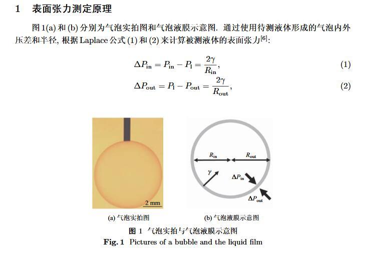 設(shè)計(jì)了一個新的表面張力測定裝置,通過實(shí)時測定液膜氣泡的半徑及其內(nèi)外壓差來獲得被測液體的表面張力。該測定液體表面張力的方法簡稱為真球氣泡法(real sphere bubblemethod,RSBM)。對十二烷基硫酸鈉(sodium dodecyl sulfate,SDS)溶液的表面張力進(jìn)行了測定,結(jié)果與文獻(xiàn)值吻合,且測定裝置的絕對精度為98.2。通過檢測到的液膜氣泡突然長大所需要的最大壓差值及其表面積隨時間的變化過程,定量分析溶液起泡難易程度及氣泡大小的關(guān)系。