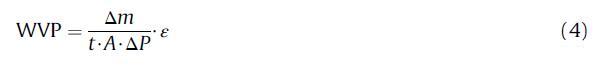 其中WVP=水蒸氣滲透率,單位g mm m-2次方h-1次方Pa-1次方;ε=厚度mm;m=質(zhì)量隨時(shí)間的變化,單位為g;t=h中的時(shí)間;A=薄膜面積,m2;和DP=杯內(nèi)薄膜表面的校正水蒸汽分壓e柜內(nèi)薄膜外表面的水蒸汽分壓。