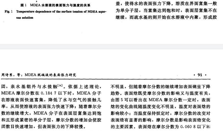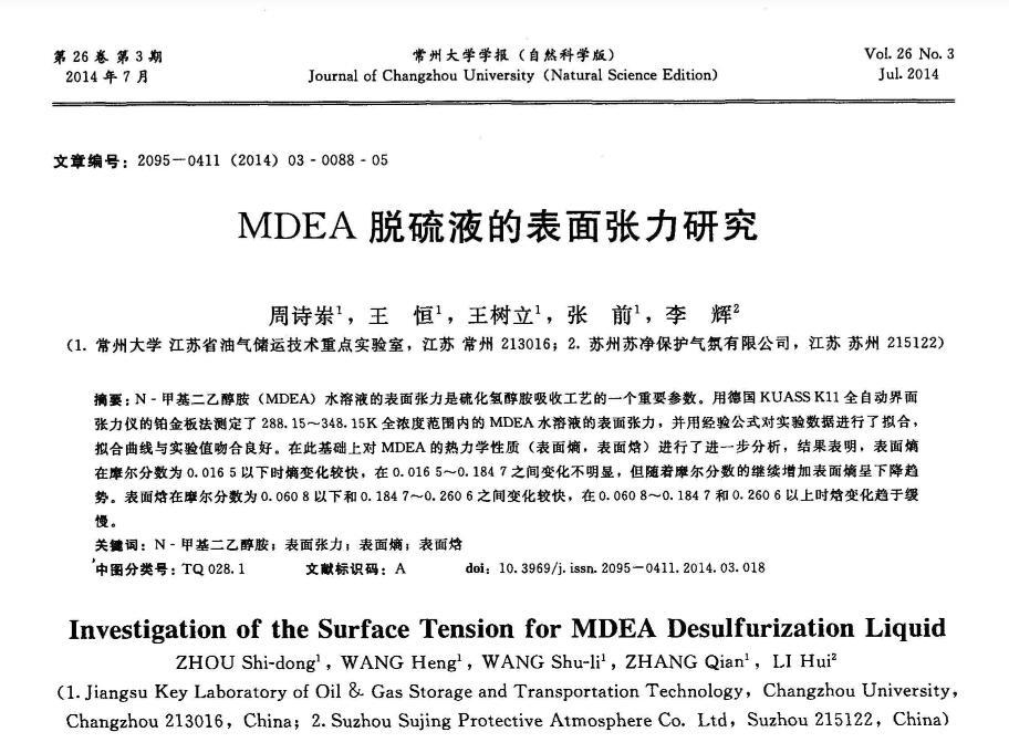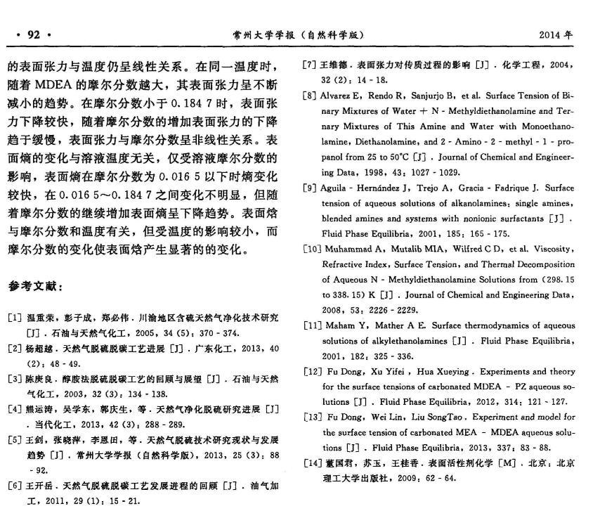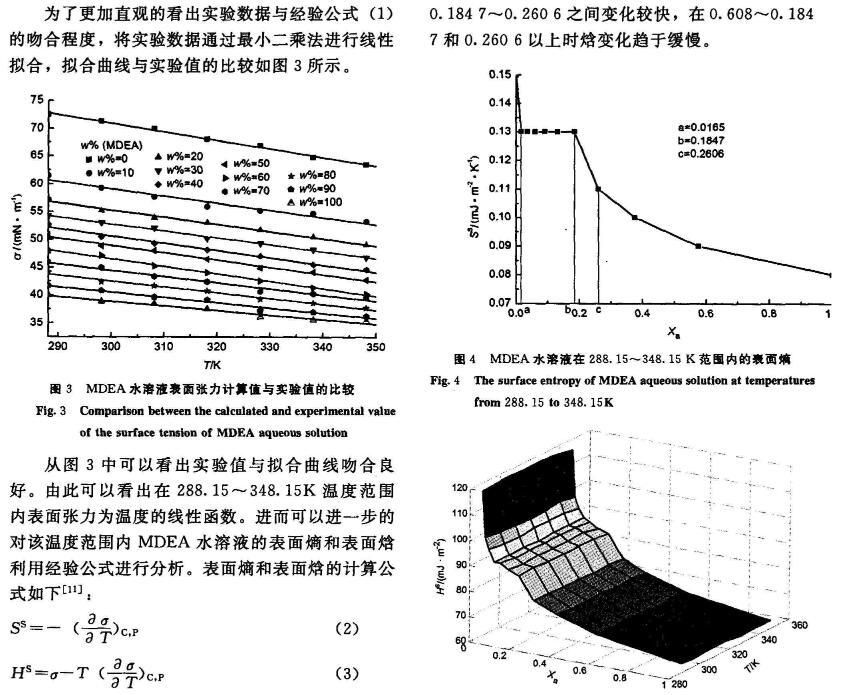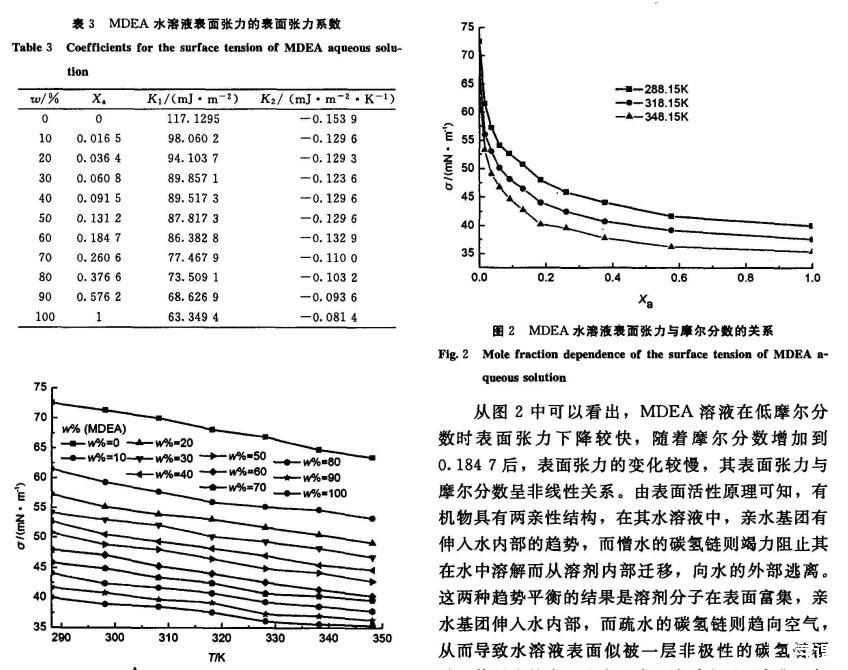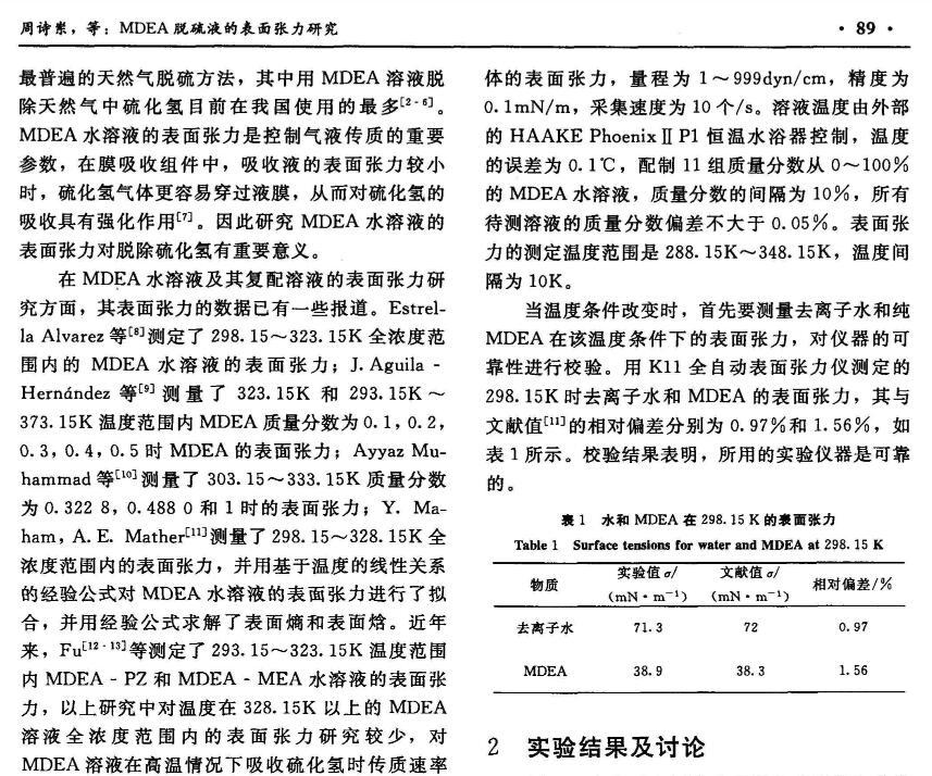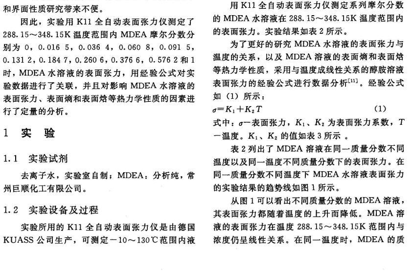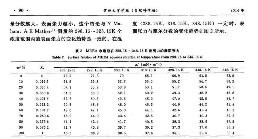 【摘要】:N-甲基二乙醇胺(MDEA)水溶液的表面張力是硫化氫醇胺吸收工藝的一個(gè)重要參數(shù)。用德國KUASS K11全自動(dòng)界面張力儀的鉑金板法測定了288.15~348.15K全濃度范圍內(nèi)的MDEA水溶液的表面張力,并用經(jīng)驗(yàn)公式對實(shí)驗(yàn)數(shù)據(jù)進(jìn)行了擬合,擬合曲線與實(shí)驗(yàn)值吻合良好。在此基礎(chǔ)上對MDEA的熱力學(xué)性質(zhì)(表面熵,表面焓)進(jìn)行了進(jìn)一步分析,結(jié)果表明,表面熵在摩爾分?jǐn)?shù)為0.016 5以下時(shí)熵變化較快,在0.016 5~0.184 7之間變化不明顯,但隨著摩爾分?jǐn)?shù)的繼續(xù)增加表面熵呈下降趨勢。表面焓在摩爾分?jǐn)?shù)為0.060 8以下和0.184 7~0.260 6之間變化較快,在0.060 8~0.184 7和0.260 6以上時(shí)焓變化趨于緩慢。