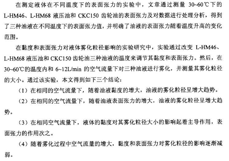 在黏度和表面張力對液體霧化粒徑影響的實(shí)驗(yàn)研究中,實(shí)驗(yàn)通過改變L-HM46、 L-HM68液壓油和CKC150齒輪油三種油液的溫度來調(diào)節(jié)其黏度和表面張力。然后,在30~60℃的溫度內(nèi)和6~12L/min的空氣流量下對三種油液進(jìn)行霧化,并測量其霧化粒徑的大小。通過該實(shí)驗(yàn),本文得到如下三個結(jié)論:
