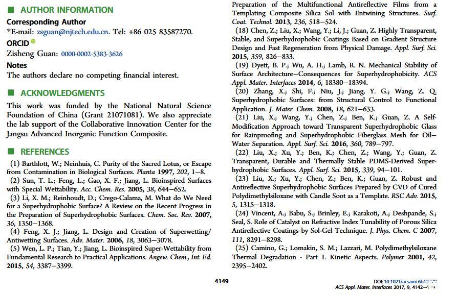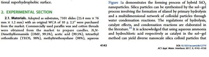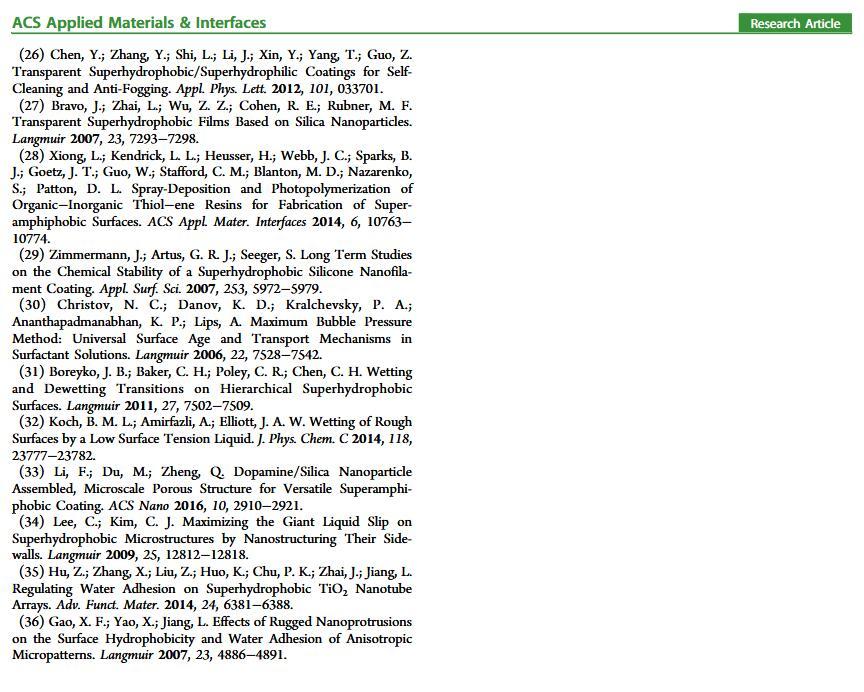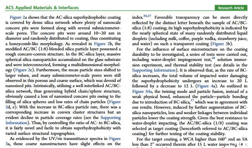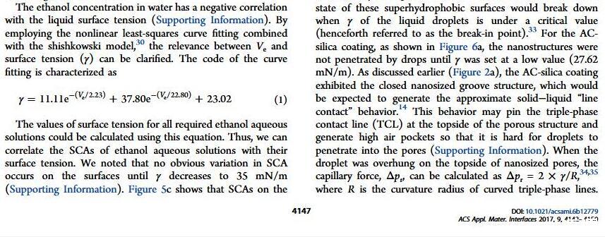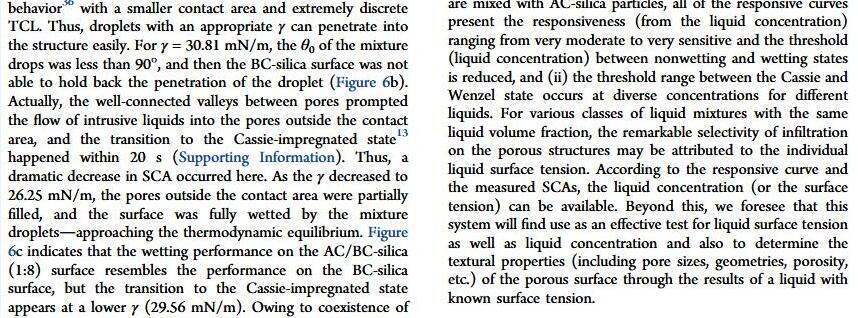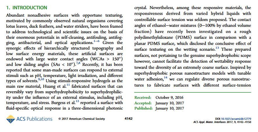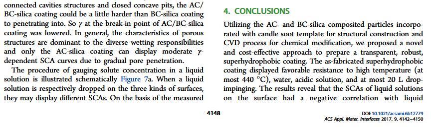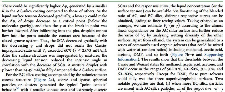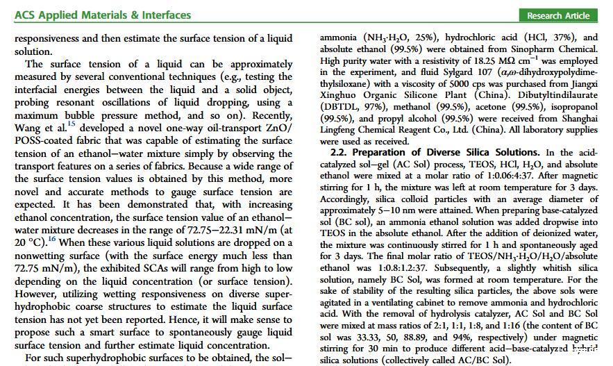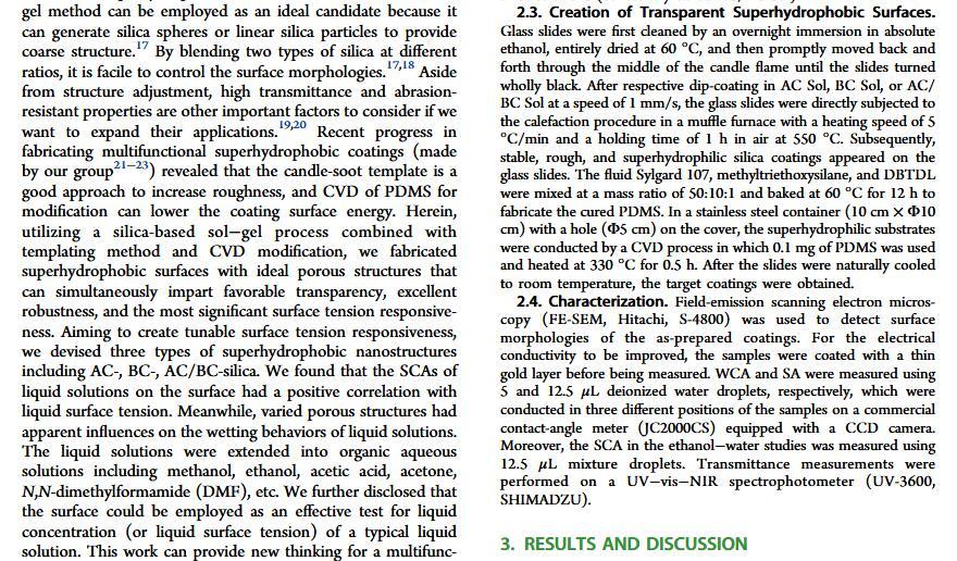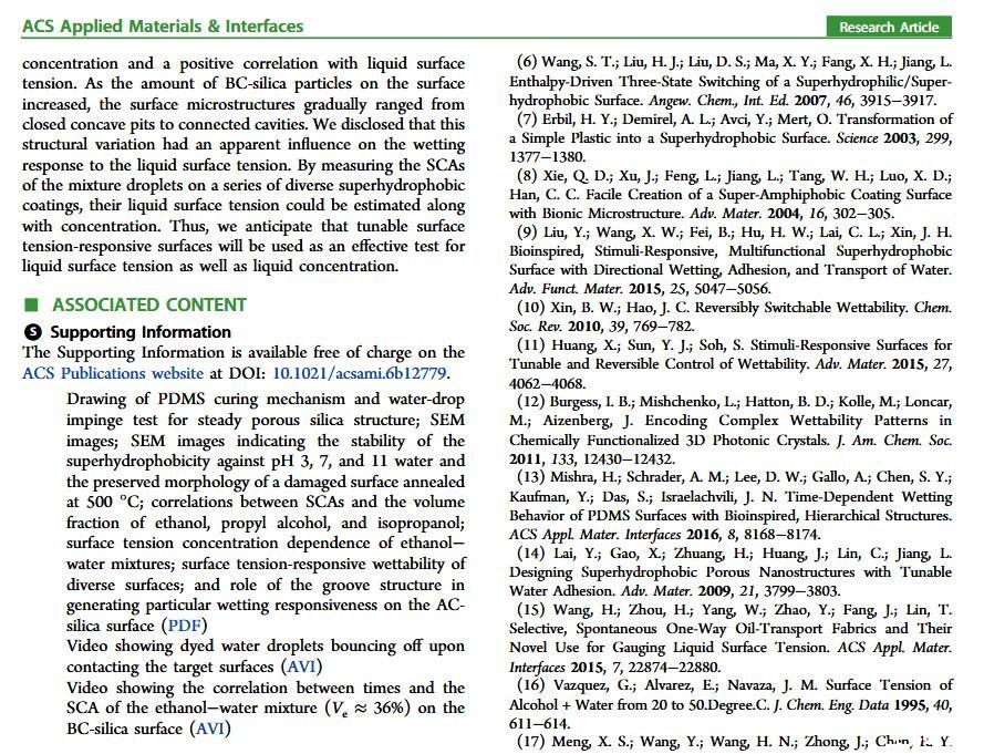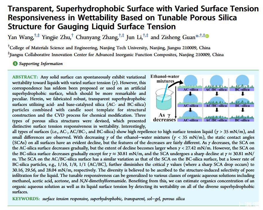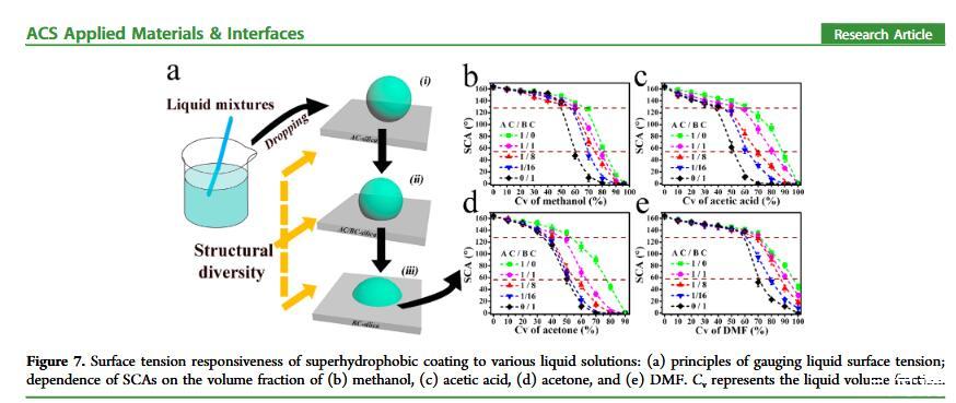 當(dāng)液體的表面張力發(fā)生變化時,它在普通固體表面的潤濕性也會隨著變化。然而,關(guān)于這一規(guī)律以及尤其是在超疏水表面的表現(xiàn)的研究很少。最近,協(xié)同創(chuàng)新中心PI-6管自生老師課題組研究生王研等人利用上述的表面張力和潤濕性的響應(yīng)關(guān)系首次將透明超疏水涂層應(yīng)用在探測液體表面張力方面,為拓寬多功能超疏水涂層的應(yīng)用提供了一個新的思路,相關(guān)論文已被ACS applied materials&interfaces發(fā)表。研究表明,隨著有機物水溶液中有機物體積分?jǐn)?shù)上升,溶液的表面張力相應(yīng)地下降,溶液液滴在制備的超疏水涂層的接觸角也逐漸下降,此稱之為表面潤濕性對表面張力的響應(yīng)。基于此響應(yīng)關(guān)系,可以通過接觸角估測液體的表面張力以及有機物的濃度。