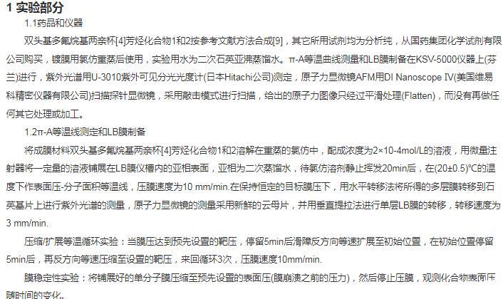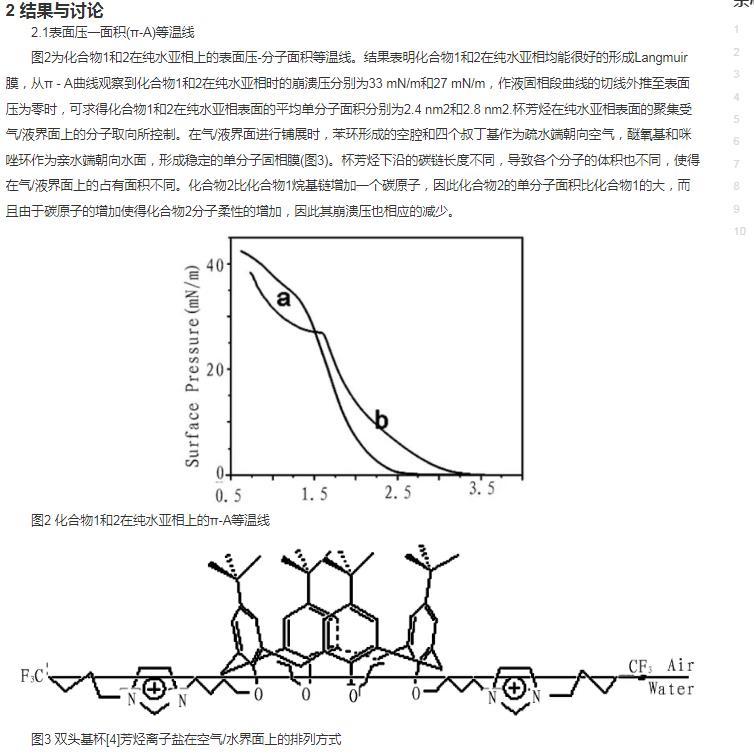 Langmuir-Blodgett膜技術(shù)(LB膜)是一種精確控制薄膜厚度和分子排列的單分子膜沉積技術(shù),即在水氣界面上能將成膜材料分子加以緊密有序地排列,形成單分子層,然后再轉(zhuǎn)移到固體襯底上的制膜技術(shù),利用該技術(shù)可以將功能化合物的光學(xué)、電磁學(xué)、分子識(shí)別與催化等性質(zhì)轉(zhuǎn)移到膜材料中。杯芳烴是繼環(huán)糊精、冠醚之后出現(xiàn)的第三代超分子主體分子,它具有空腔可調(diào)節(jié),構(gòu)象可變換,并易于化學(xué)改性和修飾等特點(diǎn),特別是對(duì)它進(jìn)行適當(dāng)修飾以后的化合物在材料化學(xué),配位化學(xué),生物化學(xué)等領(lǐng)域表現(xiàn)出潛在的應(yīng)用前景與研究?jī)r(jià)值?;谏鲜稣J(rèn)識(shí)最近我們合成了雙頭基多氟烷基兩親杯芳烴化合物1和2(圖1),并對(duì)該化合物在空氣/水相界面的成膜性能以及LB膜的結(jié)構(gòu)進(jìn)行了研究。