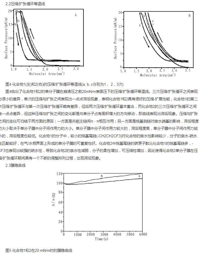 合成了雙頭基多氟烷基兩親杯芳烴化合物1和2,并對(duì)該化合物在空氣/水相界面的成膜性能進(jìn)行了研究,利用表面壓一面積(π-A)等溫線、壓縮/擴(kuò)張循環(huán)等溫線與膜穩(wěn)曲線,紫外光譜和原子力顯微鏡對(duì)組裝的LB膜進(jìn)行了結(jié)構(gòu)表征,表明化合物1和2在空氣/水相表面均能很好的形成穩(wěn)定的Langmuir膜,取代基碳原子數(shù)的增加使得化合物2的Langmuir膜單分子面積增加,崩潰壓相應(yīng)減少,組裝的LB膜均為H-聚集體,結(jié)構(gòu)均勻,穩(wěn)定性好。