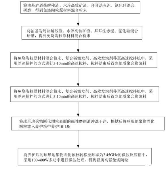 本發(fā)明一種油基巖屑-高鈦礦渣-赤泥基輕質(zhì)高強(qiáng)免燒陶粒及其制備方法,本發(fā)明使用油基巖屑熱解殘?jiān)⑺愀哜伒V渣、拜爾法赤泥作為免燒陶粒的主要原材,能夠促進(jìn)其地質(zhì)聚合反應(yīng)的發(fā)生,增強(qiáng)對(duì)油基巖屑?xì)堅(jiān)鼉?nèi)重金屬離子的固化;