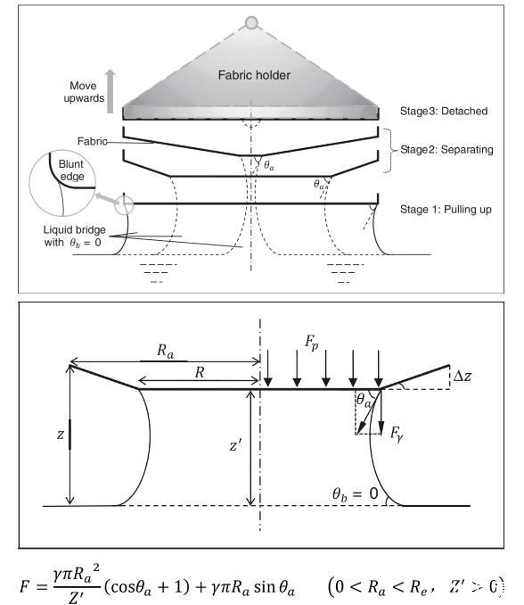 基于液體表面張力的理論模型從濕態(tài)貼附現(xiàn)象的成因出發(fā)進行構建,可預測分離過程第二階段(逐漸分離階段)中各種織物與液體之間的貼附力。